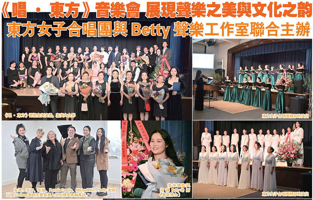 【西雅圖訊】由东方女子合唱团與Betty声乐工作室主辦,Belleve Opera, The Fairview Church, 和華州國際演藝協會(IPA) 協辦的《唱�东方》 Sing The East 音樂會於2025年11月9日在The Fairview Church 的劇場演出成功!當天現場座無虛席,觀眾沉浸在東西方經典曲目的悠揚旋律中,度過了一個難忘的音樂午後。 音樂會節目內容豐富多元,從古詩詞改編的合唱作品,到現代流行與歌劇選段,充分展現出演出者們對音樂的熱情與專業水準。 演出以崔开潮作詞、刘洋作曲的《声声慢》揭開序幕,隨後由东方女子合唱团、Annabelle Li與冉珃欣欣共同演繹的《越人歌》與《送别+城南送别》更以婉轉的旋律喚起觀眾心中的鄉愁。指揮Betty Gao與鋼琴伴奏何大顿的默契配合,使得音樂更添感染力。 緊接著,《苏州河》由Christina Su、Jasmine與苏新雅三人帶來動人詮釋;而《勿听》由贾薪羽與Xinrui Yang演唱,展現出當代年輕聲樂家的深厚實力。 兩位青年表演者Hanyu與Yakkov Leng以英語音樂劇作品《Dear Theodosia》打動人心,跨越語言界限,贏得現場掌聲。陳行健與苏亨的《心脏》充滿戲劇張力,而Victor Wu演唱的歌劇選段《冰凉的小手》出自意大利作曲家 Giacomo Puccini 的四幕歌剧 La Boh�me的歌劇《波西米亞人》)則以純熟的技巧與深情詮釋驚艷全場。此曲是咏叹调天花板古稀之年首次上台唱难度最高的咏叹调。 女聲三重唱組合Chenyun Zhu、Mara Mihali與Keyu Guo帶來輕快的《Sing for Your Supper》,展現明亮活潑的舞台魅力。 晚會的特別嘉賓表演同樣精彩,由 Michael Nim、Victor Wu 與 Huangxing Li 以三男高合唱的形式演繹義大利經典《我的太陽》以及普契尼名作《今夜無人入眠》,並由鋼琴家鞠婷婷細膩伴奏。三位歌者一首比一首更具難度,層層推高的音域將現場氣氛帶至高潮。 壓軸曲目《多麼快樂的一天》,是法語。更展現三位男高音的極限演唱,只在結尾短短一段便連續衝上九個 high C,技巧難度極高,氣勢驚人。無論從勇於挑戰的高度,或是現場帶來的震撼效果而言,都是晚會中難得一見、令人難忘的精彩亮點,引來現場掌聲不斷、熱烈回響。 音樂會最後,由东方女子合唱团再度登台,帶來《花开忘忧》、《这世界那么多人》、《天空之城》以及爵士名曲《Fly Me to the Moon》,為整場演出畫下完美句點。合唱團以純淨的音色與細膩的層次,詮釋出東西方音樂文化的融合之美。 本次音樂會不僅展示了西雅圖地區音樂愛好者的高水準演唱實力,也為社區帶來了一場跨越語言與文化的音樂饗宴,充分體現出「唱东方」的主題精神——以歌聲傳遞美、以音樂連結心靈。