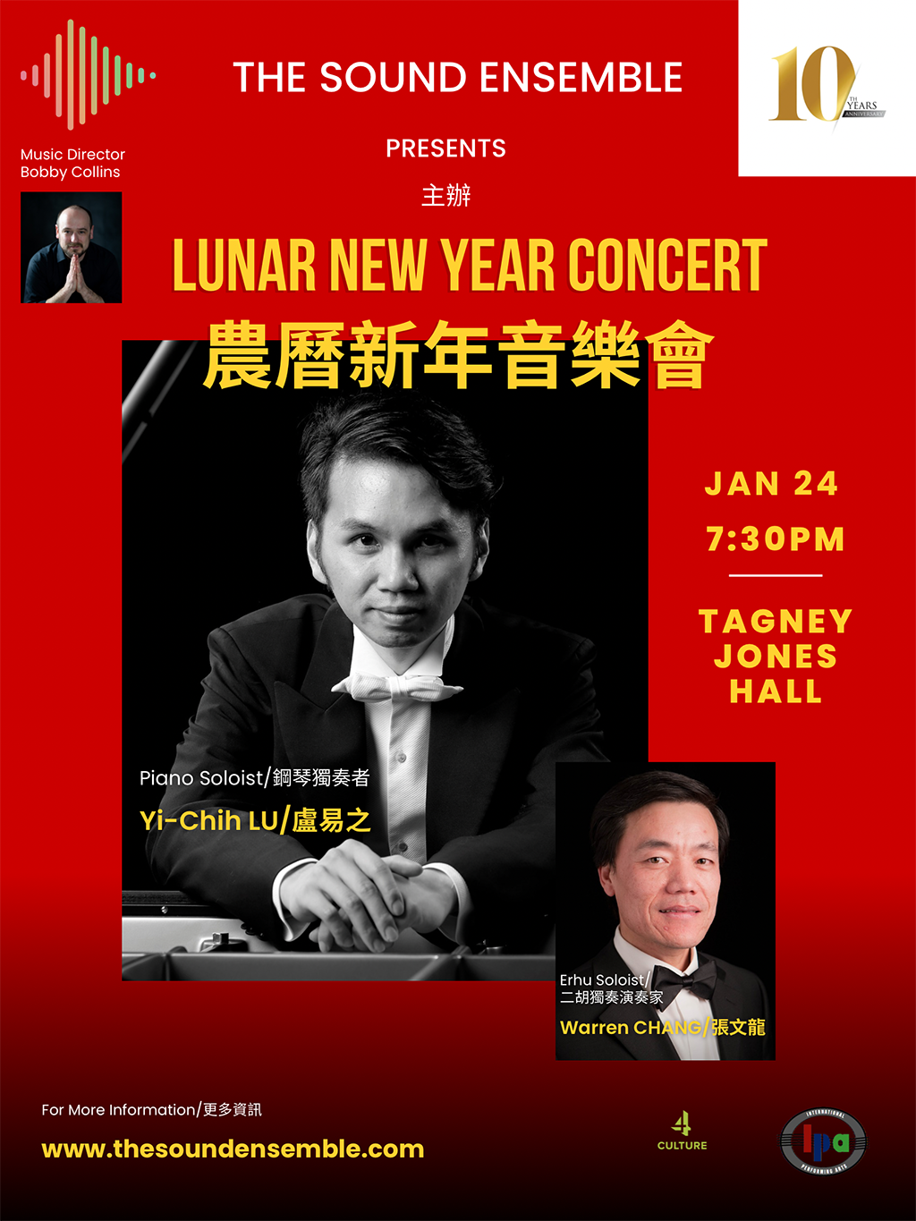 【西雅圖訊】由The Sound Ensemble首度舉辦的農曆新年音樂會(Lunar New Year Concert),將於2026年1月24日(周六)晚上7時30分在西雅圖的Tagney Jones Hall隆重登場。這是一場多元文化的音樂盛會,藉由卓越的音樂藝術家來演奏優秀的樂曲,為社區展現中西合璧、無與倫比的優美音樂和文化傳承。歡迎大眾共襄盛舉,踴躍前往欣賞這場迎接農曆新年、精彩璀璨的音樂盛會。 The Sound Ensemble由鮑比�柯林斯(Bobby Collins) 擔任音樂總監,他曾任「西雅圖歌劇院(Seattle Opera)」副指揮,及「雅基馬交響樂團(Yakima Symphony Orchestra)」助理指揮。他指出,為了讓音樂會充滿農曆新年的歡樂氣氛,並且呈現亞洲音樂的特色,這次特別邀請到:鋼琴獨奏家盧易之(Yi-Chih LU)、二胡獨奏家張文龍(Warren Chang)、西雅圖國樂團和Bellevue青年交響樂團團員、Shorecrest和Roosevelt的學生共同演出。 盧易之出生於台灣臺北,習樂於維也納音樂暨表演藝術大學,並榮獲「季弗拉大獎」特殊榮耀。隨後,他還取得柏林藝術大學最高演奏家文憑,並於仙台、胡邁爾...等13項國際鋼琴大賽中,勇奪佳績。他是一位擁有「演奏、編曲、創作」的全方位音樂藝術家,曾獲歐美許多音樂評論家的一致好評和肯定。 盧易之目前任教於台灣國立臺北藝術大學,他不僅多次和各大交響樂團合作演出,他的海外演出足跡也遍及歐美亞三洲、共45個城市。他曾在美國卡內基音樂廳、維也納金廳、柏林愛樂廳及薩爾斯堡、司徒加特、慕尼黑...等地的重要音樂廳演出。他歷年曾經合作過的樂團則包括: 奧地利國家廣播電台交響樂團、維也納太平洋室內樂團、柏林古典樂手樂團、羅馬尼亞阿拉德愛樂、日本仙台市民管弦樂團等等。 張文龍是華裔著名的二胡演奏家、教育家,他於1984年創立華州「中國藝術音樂協會」,擔任主席暨音樂總監,以發揚和傳承中華音樂文化為使命。多年來,張文龍舉辦並參與近千場中國音樂會與專題講座,將國樂融入美國主流文化、拓展其國際影響力,努力貢獻、不遺餘力。 張文龍曾應邀與國際知名日本作曲家喜多郎合作,為大型故事片「宋家皇朝」 配樂,擔任二胡領奏與獨奏。他也曾與西雅圖管弦樂團、凱斯凱交響樂團、波安吉拉交響樂團、奧林匹亞交響樂團,及西雅圖交響樂團等知名樂團合作演奏,屢獲音樂界高度讚譽。他並於2005年榮獲美國華州州長文化藝術獎,為華裔音樂家在美國贏得崇高榮譽。 The Sound Ensemble推出的2026農曆新年音樂會,節目豐富,演出曲目包括:水田寄語(顏名秀/作曲)、美濃之道(李元貞/作曲)、台東藍(顏名秀/作曲)、忘春風(鄧雨賢/作曲,盧易之、厲振倫/編曲)、菊花台(周杰倫/作曲,厲振倫、艾岱軒/編曲),壓軸節目則是由盧易之作曲、鋼琴獨奏的「第一號鋼琴協奏曲《牛犁歌》」,並聯合西雅圖國樂團、Bellevue青年交響樂團、Shorecrest和Roosevelt的學生精彩演出。 盧易之擅長將臺灣民謠的素材,巧妙地融入鋼琴演奏曲中,創作出膾炙人口的臺灣民謠演奏曲。這些作品不僅常成為他獨奏會的亮點,也在他個人YouTube頻道上獲得聽眾踴躍迴響。《牛犁歌》是他繼「望你早歸」、「天黑黑」編曲,以及創作合唱作品「包心菜」和「好䟘吔」等榮獲大獎之後,再次展現其多元創作的音樂才華。 有關The Sound Ensemble農曆新年音樂會和購票的詳情,可至www.thesoundensemble.com查詢;鮑比�柯林斯(Bobby Collins) 的個人網站:bobbycollins.org;盧易之的個人網站:www.facebook.com/pianistlu;華州中藝協會的網址:www.chineseartsandmusic.org。Tagney Jones Hall地址:363 Mercer St, Seattle, WA 98109, USA。【撰稿:王又春(Spring Wang)】 照片: (主辦單位提供)